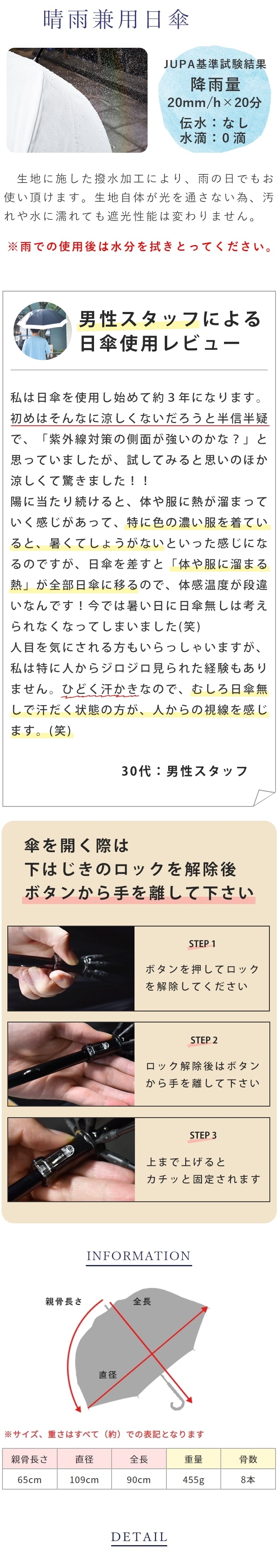 | 縫い糸・綴じ糸も日本製を日系の工場に送り込み、日本人の指導の下国内と変わらぬ組立品質で取り組んでいます。 生地は高性能な為普通の傘生地より厚みがありますので、軽量な骨との重みの関係性にてやや閉め止まりにくいですが必ず紐で纏めていただけますようお願いします。 破損や伸縮できなくなるのを防ぐ為、中棒には「あそび」の部分を持たせております。グラつきと勘違いされることがございますが、ご理解下さいますようにお願いします。 縫製は可能な限りの最善のピッチにより努力をしております。稀に張りの関係上縫製の針孔を気にされる場合がございますが、生地自体の加工が一般の日傘比較の上で高遮光率100%の性質を維持している見地から完全遮光日傘とさせていただいております。その概念で捉えていただきますようお願い致します。 | 商品情報 |