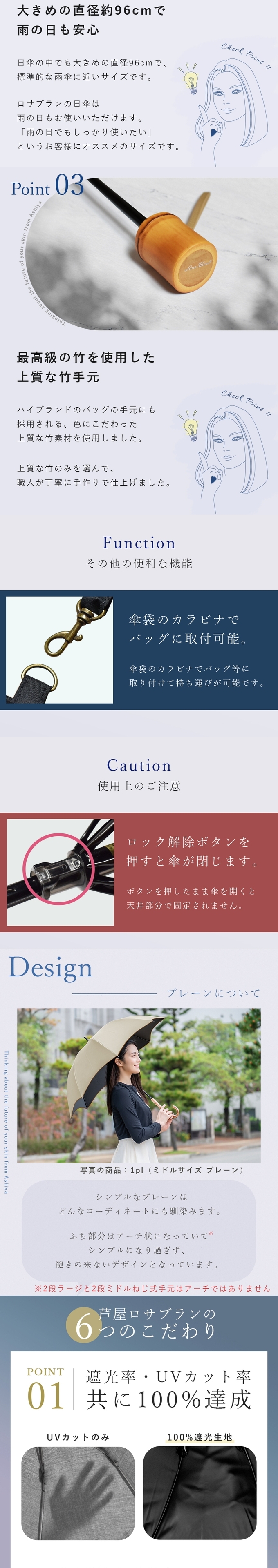 親骨を変更したため同じ2段折りタイプの50cm/60cmの商品より開閉しやすく、傘をさした時のカーブが少し浅めに、日傘を閉じた時に表地が外側にくるようになりました。