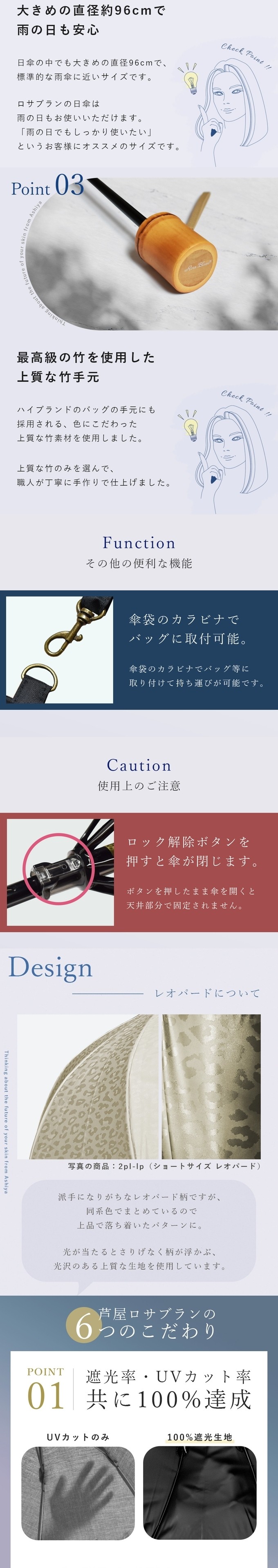 | ロサブランの日傘について | 遮光にこだわりぬいた日本製生地 低コストの海外製加工生地では例え検査機関の証明が出たとしても、生地全体として安定した遮光率を維持することに限界があり、当社は日本製の加工生地を使用しています。