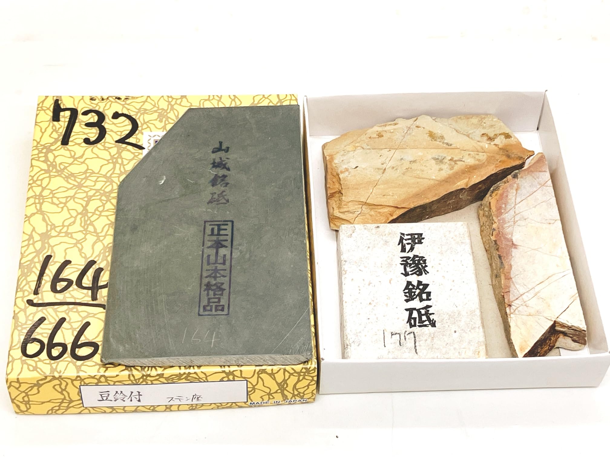 色:中世山城銘砥 山本流鍛え済原石 函外寸(概寸)肥後守十丁箱入約164-666g #box732 天然砥石
