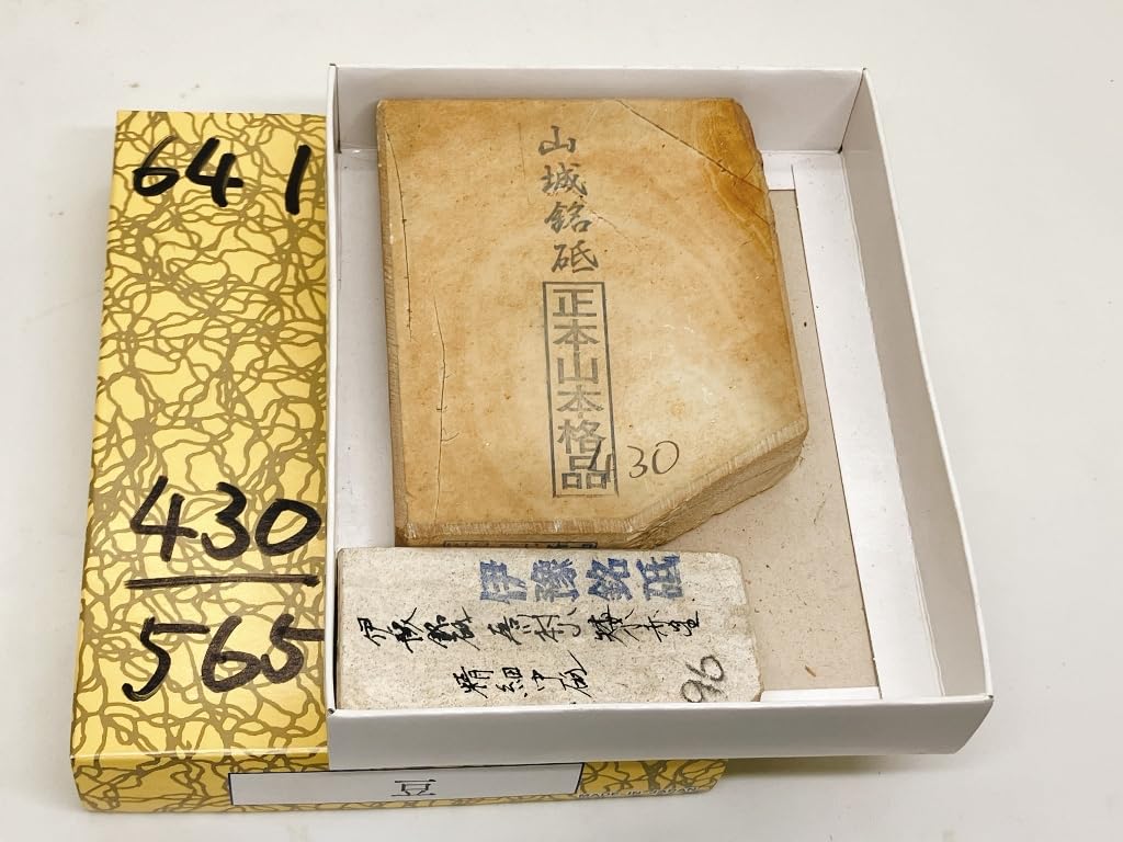 色:中世山城銘砥 山本流鍛え済原石 函外寸(概寸)肥後守十丁箱入約430-565g #box641 天然砥石