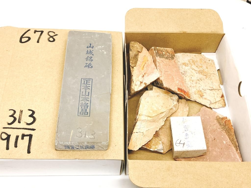 色々な種類や大きさ形が入っています。研ぐ刃物に対して、サイズに余裕のある石は其のまま面を付けて。そうで無い物は小割りにして刀剣研磨の要領 でも使えます。