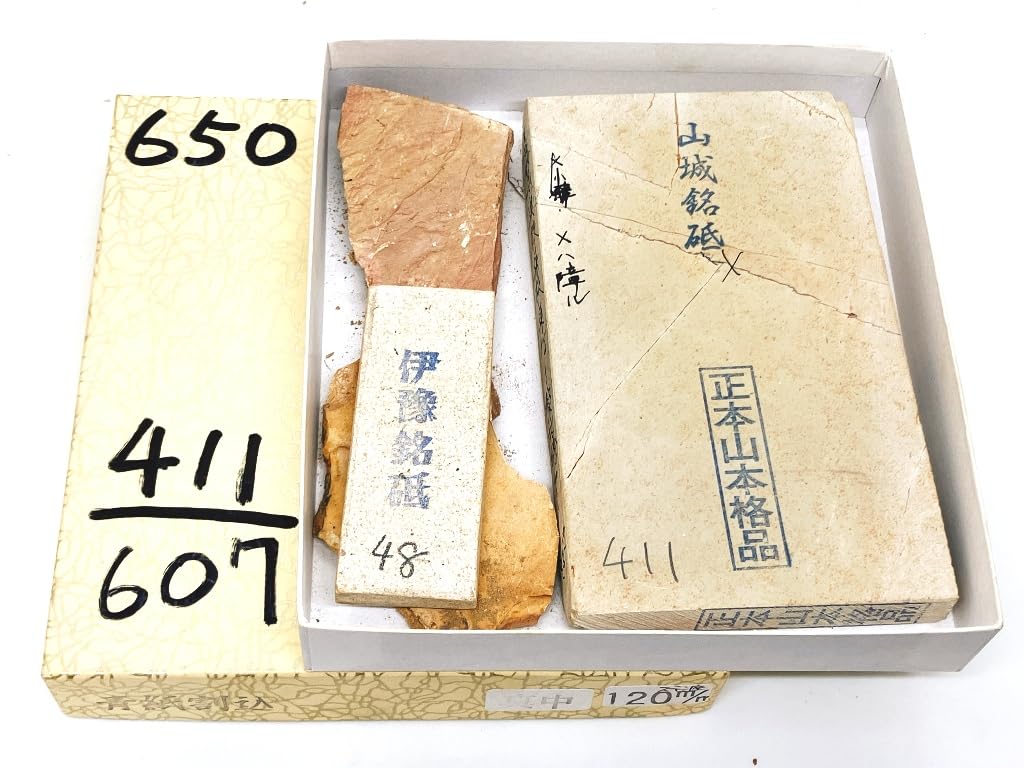 色:中世山城銘砥 山本流鍛え済原石 函外寸(概寸)肥後守十丁箱入約411-607g #box650 天然砥石