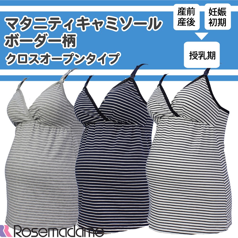 マタニティ キャミソール ボーダー柄 マタニティキャミソール 授乳 クロスオープン インナー 妊婦 ローズマダム 6061