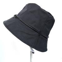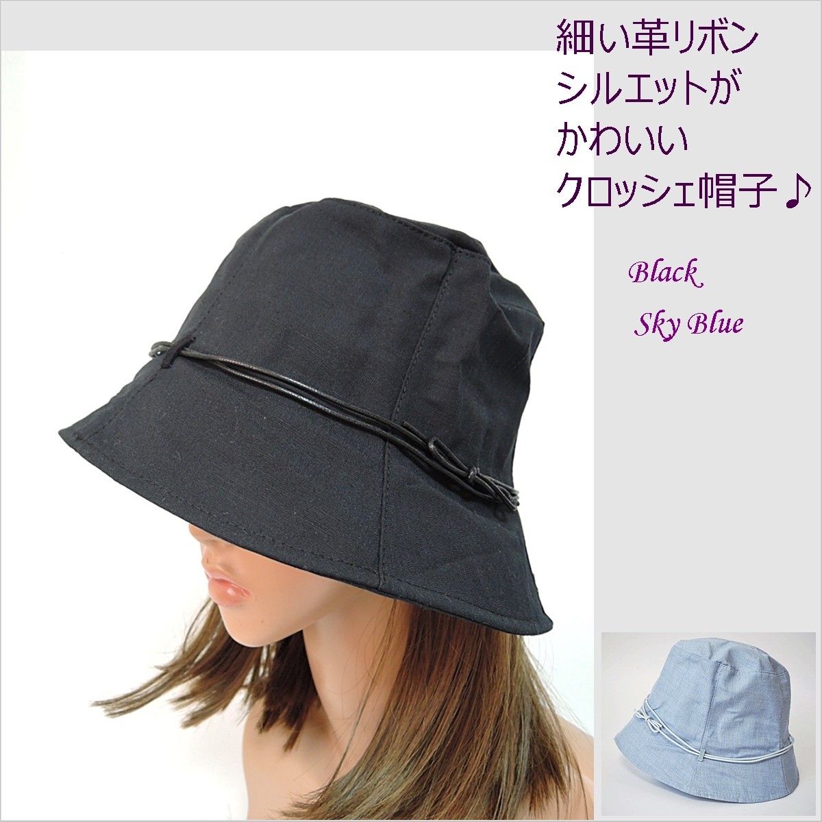 レディース帽子 クロッシェ帽子 シンプル帽子 麻素材 スカイブルー ブラック 革リボン付き