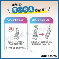 | 電池交換について | 【コードレス電話機の本体と電池交換について】 コードレス・FAX電話機に内蔵されている電子部品には寿命があり、 液晶や台座の経年劣化により、異常な残量表示が見られたり、 十分な充電ができない等の症状が発生することがございます。 症状の改善が見られない場合は、機器の買い替えをお勧め致します。 |