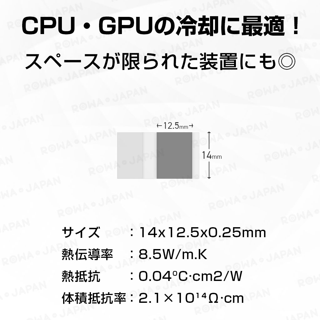 | 使用方法 | ■使用方法 1.シートの貼る位置(チップやヒートシンク)をアルコール綿でよく拭いて清掃します。 2.シートを貼る面よりやや小さめにカットしてください。 3.片面のフィルムを剥がし、平らに貼り付けます。 4.表面に凹凸がないことを確認したら、もう一方のフィルムを剥がして完了です。 ※パソコンなどで貼り付け箇所が2箇所ある場合、チップまたはヒートシンクのどちらか一方のみに貼ってください。 ■注意点 ※本製品は相変化材料ですので、室温が32℃を超える環境では、柔らかくなったり、変形が生じる可能性がありますが、使用や性能には影響ありません。 ※使用前に数分間冷蔵庫で冷やすと、より貼りやすくなります。 ※未使用品は冷蔵庫で保管することを推奨します。 |