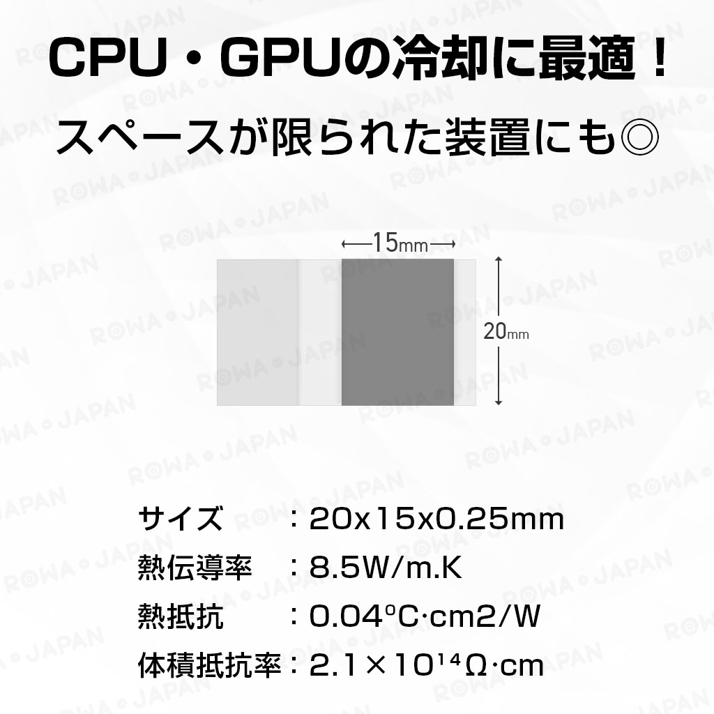 | 使用方法 | ■使用方法 1.シートの貼る位置(チップやヒートシンク)をアルコール綿でよく拭いて清掃します。 2.シートを貼る面よりやや小さめにカットしてください。 3.片面のフィルムを剥がし、平らに貼り付けます。 4.表面に凹凸がないことを確認したら、もう一方のフィルムを剥がして完了です。 ※パソコンなどで貼り付け箇所が2箇所ある場合、チップまたはヒートシンクのどちらか一方のみに貼ってください。 ■注意点 ※本製品は相変化材料ですので、室温が32℃を超える環境では、柔らかくなったり、変形が生じる可能性がありますが、使用や性能には影響ありません。 ※使用前に数分間冷蔵庫で冷やすと、より貼りやすくなります。 ※未使用品は冷蔵庫で保管することを推奨します。 |