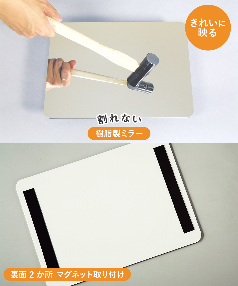 樹脂製のミラーとアルミ樹脂複合材を貼り合わせ、割れずに軽く、取り付けも手軽で簡単。マグネットで脱着自在。