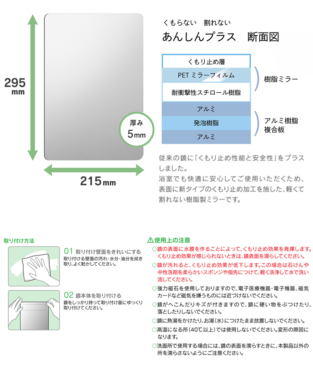 ガラスを使わない複合素材の鏡で、災害時にも「割れない」ので安心・安全。