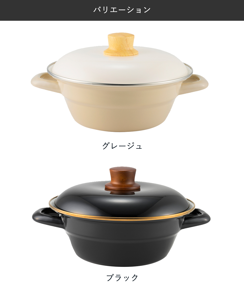本体・フタ:ほうろう用鋼板 ツマミ:天然木 リング部分:ステンレス
