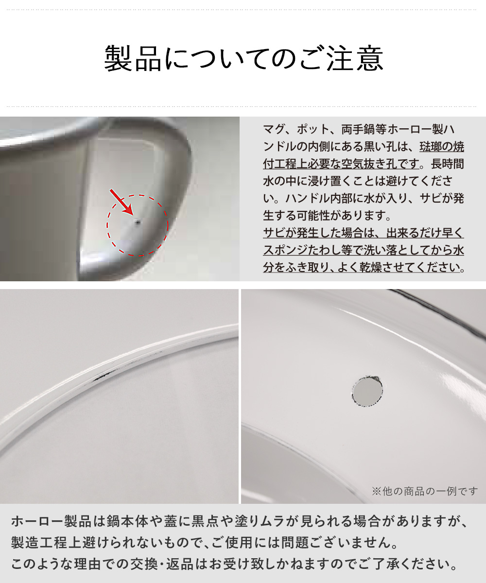 ・ホーロー製品は手作業で釉薬をかけておりますので、多少の個体差がございます。鍋本体や蓋に黒点や塗りムラが見られる場合がありますが、製造工程上避けられないもので、安心してご使用頂けます。このような理由での交換・返品はお受けできかねますのでご了承ください。