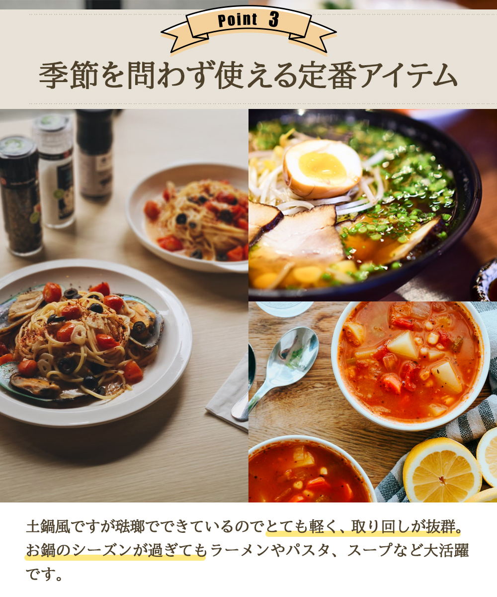 熱効率が高く保温性も良いため、鍋料理に最適です。