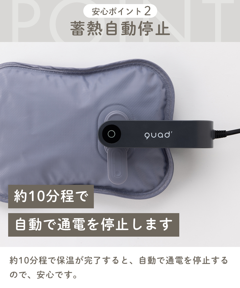 電気で本体内部の水をあたためて熱をためるため、面倒なお湯の交換が不要。約10分の蓄熱で最長約8時間あたたかさが持続するので、就寝時には朝までポカポカが続きます。