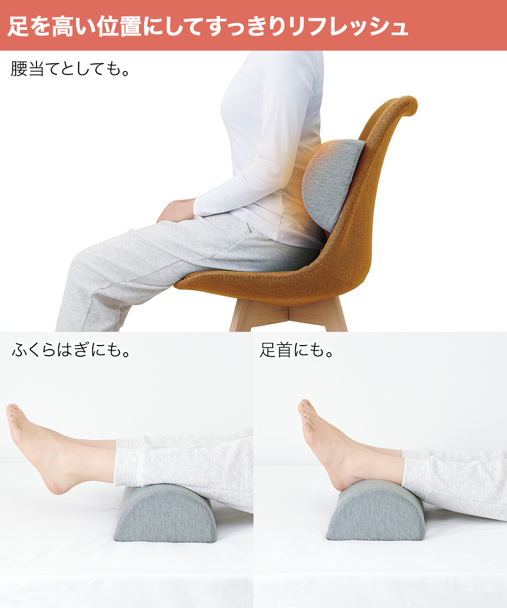 ドーム形状のクッションが足首やふくらはぎをやさしく支え、足を高い位置にキープすることで血流を促進。冷えによる不快感やむくみ、だるさを和らげ、スッキリ軽やかな足へ導きます。