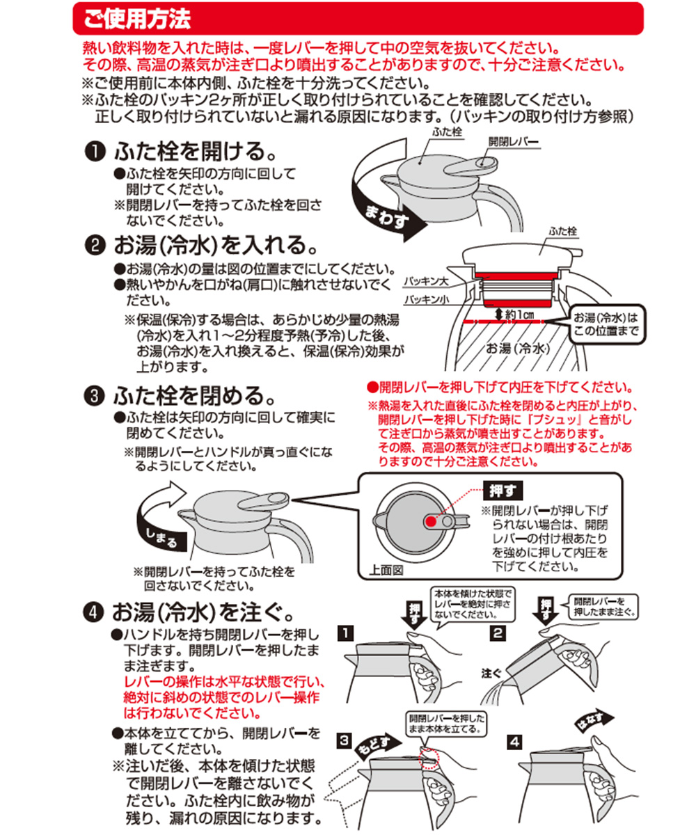 ふた栓は確実に閉めてご使用下さい。熱いものを入れて使用する場合は、転倒させて中身が流れ出ないように注意して下さい。