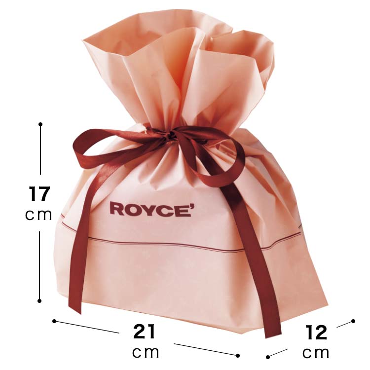 ROYCE'のロゴが入ったバレンタイン限定デザインのギフトポリ袋の大サイズです。リボンを結ぶ巾着タイプの袋です。