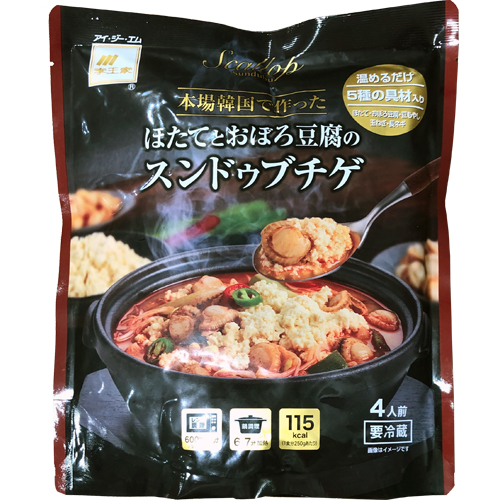 ■原材料名:豆腐、たまねぎ、もやし、ほたて、スンドゥブチゲベース(植物油脂、食塩、魚介エキス、その他)、ねぎ、香辛料、唐辛子エキス、牛エキス、おろしにんにく、ねぎエキス、鶏骨エキス、ごま油、たん白加水分解物/調味料(アミノ酸等)、増粘剤(加工デンプン、増粘多糖類)、着色料(カロテイノイド、カラメル)、酸化防止剤(V.C)、カゼインNa、ph調整剤、乳化剤、甘味料(キシロース)、香辛料抽出物、香料、(一部に小麦・いか・牛肉・ごま・大豆・鶏肉・豚肉・魚醤(魚介類)を含む)