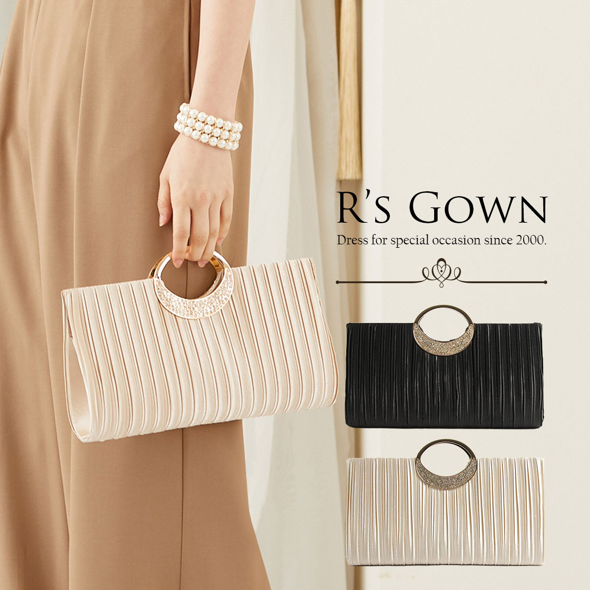 上品でシンプルなプリーツ。ゴールドの持ち手にラインストーンを施し、エレガントな装いを演出。フォーマルシーンのコーディネートを、ワンランク上げてくれるバッグです。