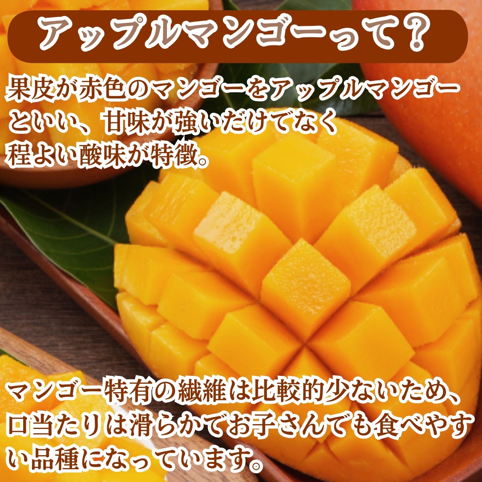 アップルマンゴーとは果皮が赤色のマンゴーをアップルマンゴーといい、甘味が強いだけでなく程よい酸味が特徴。マンゴー特有の繊維は比較的少ないため、 口当たりは滑らかでお子さんでも食べやすい品種になっています。