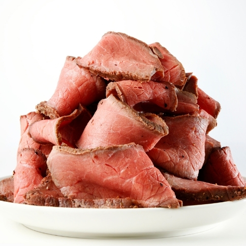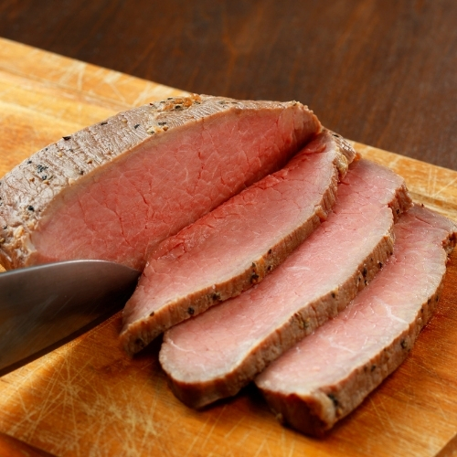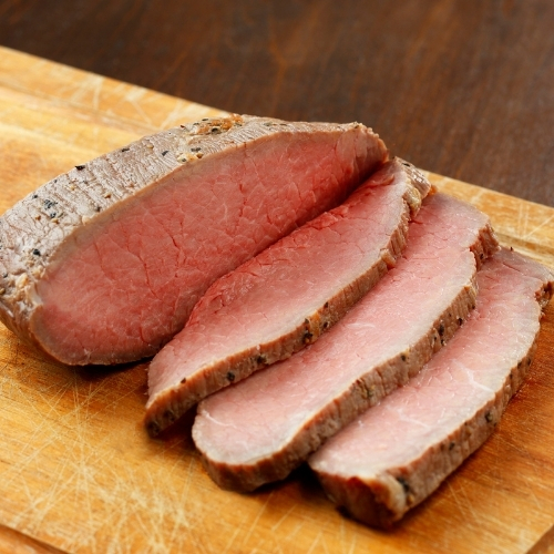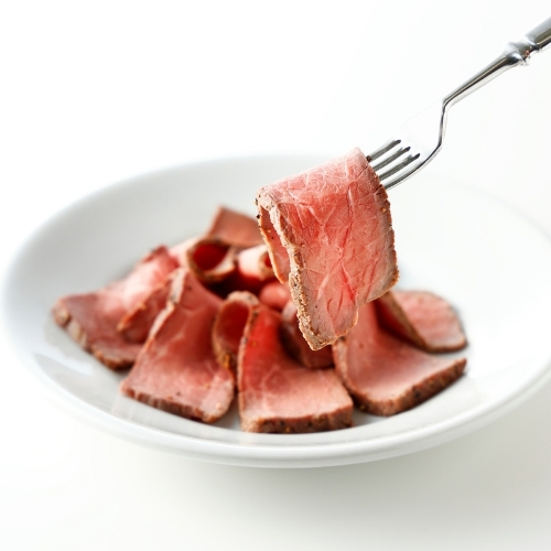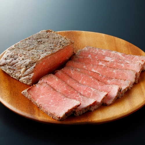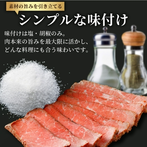 ●【素材の旨みを引き立てるシンプルな味付け】米国産の牛外もも肉をじっくりと時間をかけて低温調理した本格派のローストビーフです。味付けはシンプルに塩・胡椒のみです。スライスもしくはダイスカットにしてお好みの用途にご使用ください。