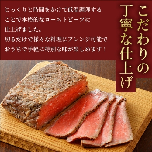●【こだわりの丁寧な仕上げ】じっくりと時間をかけて低温調理することで本格的なローストビーフに仕上げました。 切るだけで様々な料理にアレンジ可能でおうちで手軽に特別な味が楽しめます。