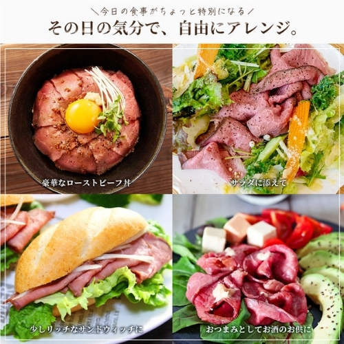 ●【その日の気分で自由にアレンジ】(1)豪華なローストビーフ丼(2)サラダに添えて(3)少しリッチなサンドウィッチに(4)おつまみとしてお酒のお供に
