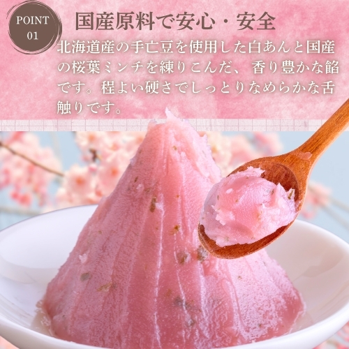 春を感じる国産桜あんこ。ふんわり香る桜の風味と上品な甘さが特徴。春のお菓子作りにピッタリ! 北海道産の手亡豆を使用した白あんと国産の桜葉ミンチを練りこんだ、 香り豊かな餡です。程よい硬さでしっとりなめらかな舌触りです。