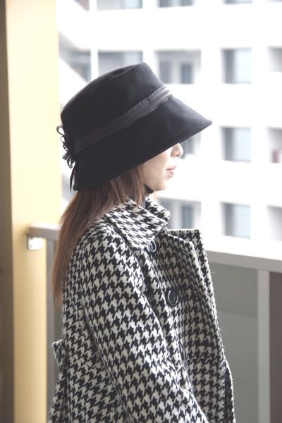 女優風 手作り帽子 黒のクロッシェ ウール素材