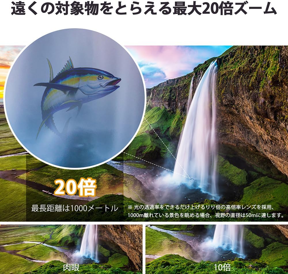 【高透過率のレンズ採用】光学倍率をコンサートシーンで使える40倍を維持したまま、光の透過率をできるだけ上げることのできるレンズを採用。薄暗い場所でも明快なブルーレイ画質を見える可能。40倍の倍率で、100m先の人を裸眼で4m先から見るのと同じ大きさで見えます。目の前に臨場感を見逃さないように。