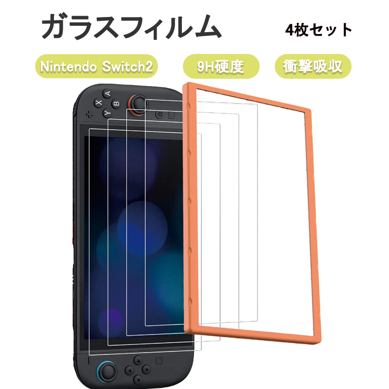 4枚入り Switch 2 ガラスフィルム貼り付け簡単 自己吸着タイプ 硬度9H 気泡消失 指紋防止 キズ防止 2.5Dラウンドエッジ加工 専用ガイド枠付き