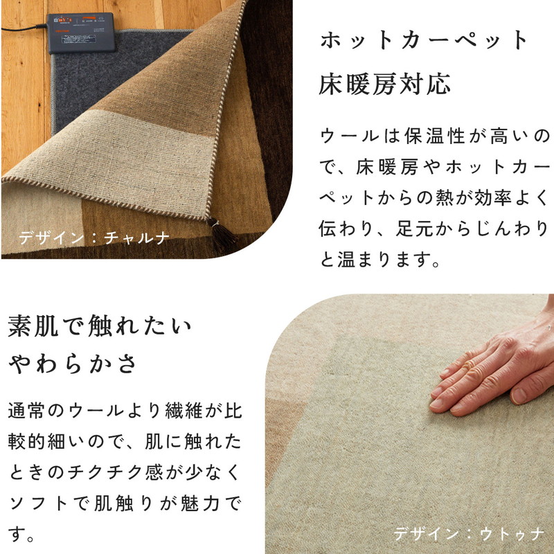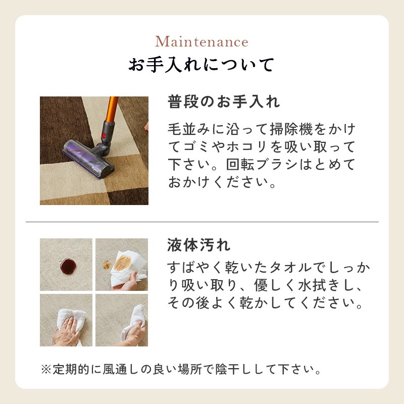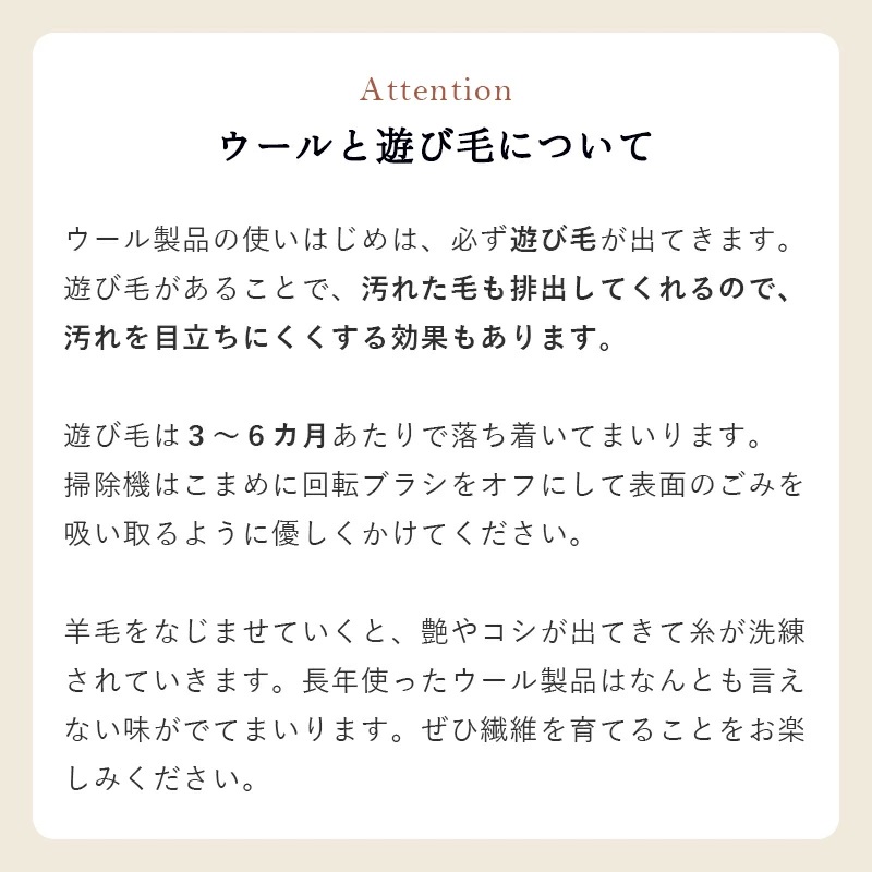 | 注意 | ※ご覧のモニターの環境、撮影環境により実物と色味が異なって見える場合が御座います。 ※一点一点手作り商品のため、糸が飛び出ていたり、他色の繊維が混じっていたりすることがあります。また、多少のサイズ誤差など個体差がございますが、予めご了承くださいますようお願い致します。 ※湿気多い時期などに天然繊維の独特の匂いがする場合があります。 ※ウール製品のため遊び毛がでます。掃除機をお使いの場合は回転ブラシをオフして優しく吸い込んでください。 ※直射日光に当たると、退色することがありますので長時間の直射日光はお避けください。 ※保管する場合は湿気や汚れを取り除いて乾燥した場所で保管してください。 |