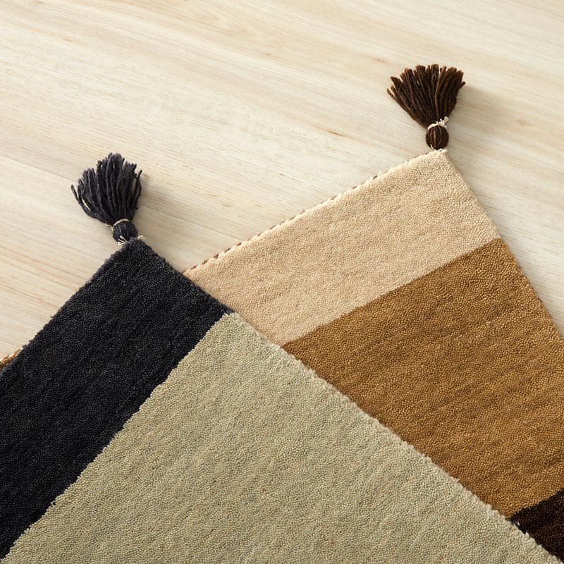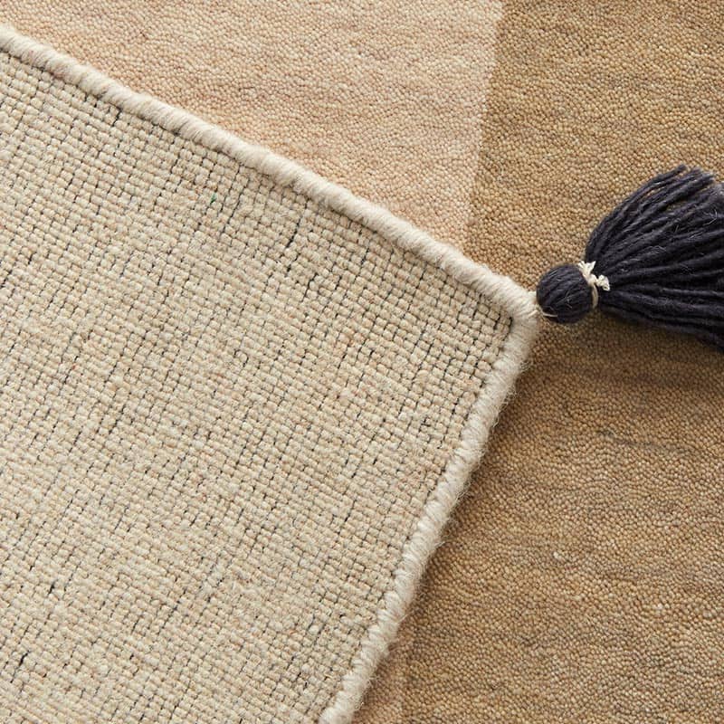 裏面を見ると織の細かさが確認できます。裏地が無い為、通気性が良く、床やたたみを傷めにくいです。四隅にはかわいいフサがついています。