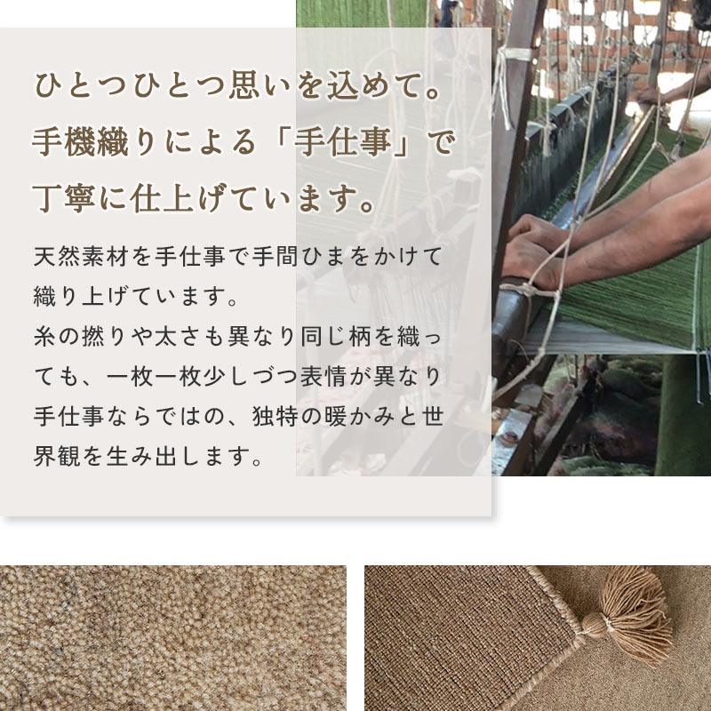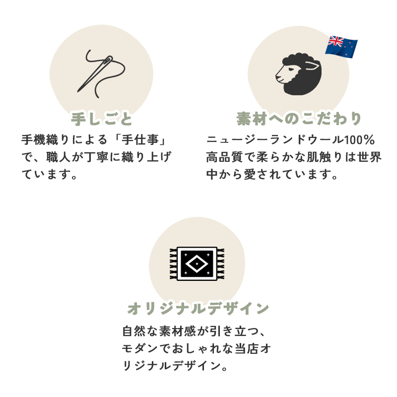 | 注意 | ※ご覧のモニターの環境、撮影環境により実物と色味が異なって見える場合が御座います。 ※一点一点手作り商品のため、糸が飛び出ていたり、他色の繊維が混じっていたりすることがあります。また、多少のサイズ誤差など個体差がございますが、予めご了承くださいますようお願い致します。 ※湿気多い時期などに天然繊維の独特の匂いがする場合があります。 ※ウール製品のため遊び毛がでます。掃除機をお使いの場合は回転ブラシをオフして優しく吸い込んでください。 ※直射日光に当たると、退色することがありますので長時間の直射日光はお避けください。 ※保管する場合は湿気や汚れを取り除いて乾燥した場所で保管してください。 |