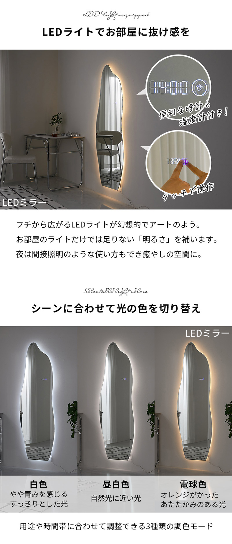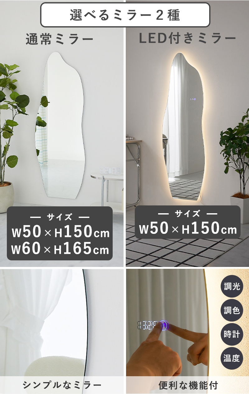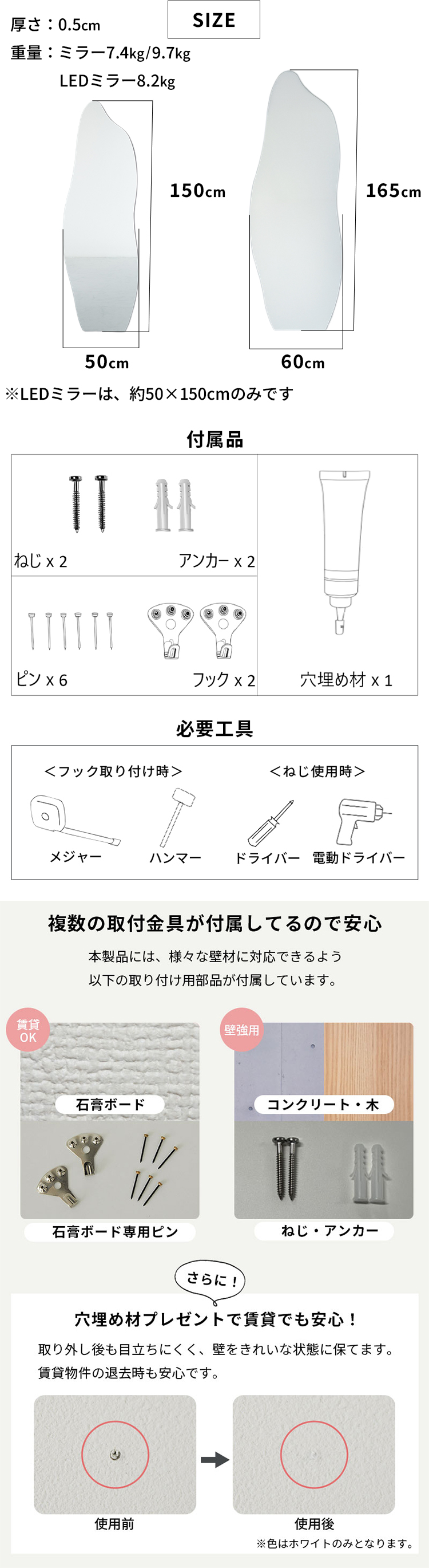 | 重量 | 通常 約50x150cm:約7.4kg 通常 約60x165cm:約9.7kg LED付き 約50x150cm:約8.2kg |