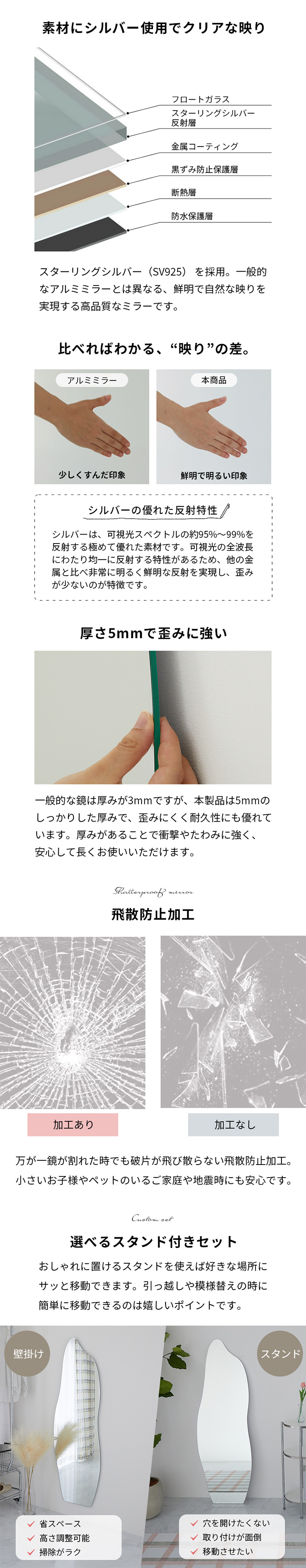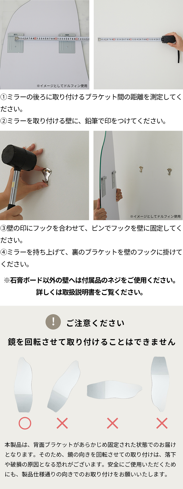 | 注意 | ※モニターにより、実物の色と若干異なる場合がございます。 ※本製品は電気用品安全法(PSE)に配慮した設計です。 ※生産ロットによって、多少誤差が発生する場合がございます。 ※ミラーの向きを回転させての取り付けはできません。 ※ピンフックは石膏ボードの壁用に設計されています。 ※石膏ボード専用ピンをご使用の際は、壁材の種類・状態・取付方法によって保持力が異なります。 ※落下防止のため、確実に固定できる壁面(下地のある箇所等)への設置、または付属のアンカー・ネジをご使用ください。 ※安全のため取り付け後は定期的に固定状態をご確認ください。 【設置場所について】 ドアやその他の可動部分へのお取り付けにつきましては、落下や破損の恐れがございますので、可動部分への設置はお控えいただきますようご理解のほどよろしくお願いいたします。 【1年間保証について】 通常のご使用において、納品後1年以内に不具合が発生した場合 →無償にて交換対応をさせていただきます。 適用条件:当店の取扱説明書および注意事項に基づいた正常な使用状態での不具合が対象となります。 交換の際は、お手数ですが不具合の画像をご提供いただきますよう、あらかじめご了承ください。 【保証対象外となる場合(有料対応)】 以下に該当する場合は、保証期間内であっても有償対応となりますのでご注意ください ・誤った使用方法や、他店・個人による修理、分解、改造などによる故障 ・火災・地震・水害・落雷など、天災や公害による損傷 ・返品された商品の状態と、お申し出の内容が著しく異なる場合 |