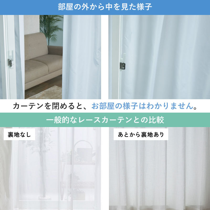 夜も見えにくい 昼も夜も、外から室内が見えにくいレースカーテンです。明かりをつけてもシルエットが映りにくく、プライバシーを守ります。日中は光を取り入れ、夜は厚手カーテンがなくても中が見えにくいので、1枚使いにおススメの効果です。