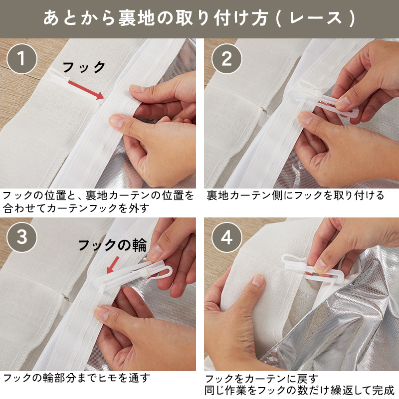 機能のあるカーテンが欲しいけど、買い替えもめんどくさい!なんて時はこのあとから裏地があれば簡単に機能レースに変身できます。