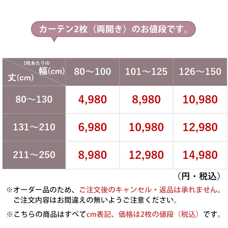 | 注意 | ※ご覧のモニターの環境、撮影環境により実物と色味が異なって見えます。 ※商品名に表記されているサイズ(丈)はカーテンフックのレール取付け部分から測った長さを表記しています。 ※仕上がりサイズは縫製工程上、1cm程度の誤差がある場合がございます。丈はフックのアジャスターでご調節ください。 ※生地の性質上、窓からの光の角度によって継ぎ目から光が漏れる場合がありますのでご了承ください。 ※スチームアイロンをかけて頂くと、生地のシワが取れやすくなります。 ※上記に関しての返品交換はお受けできかねます。 |