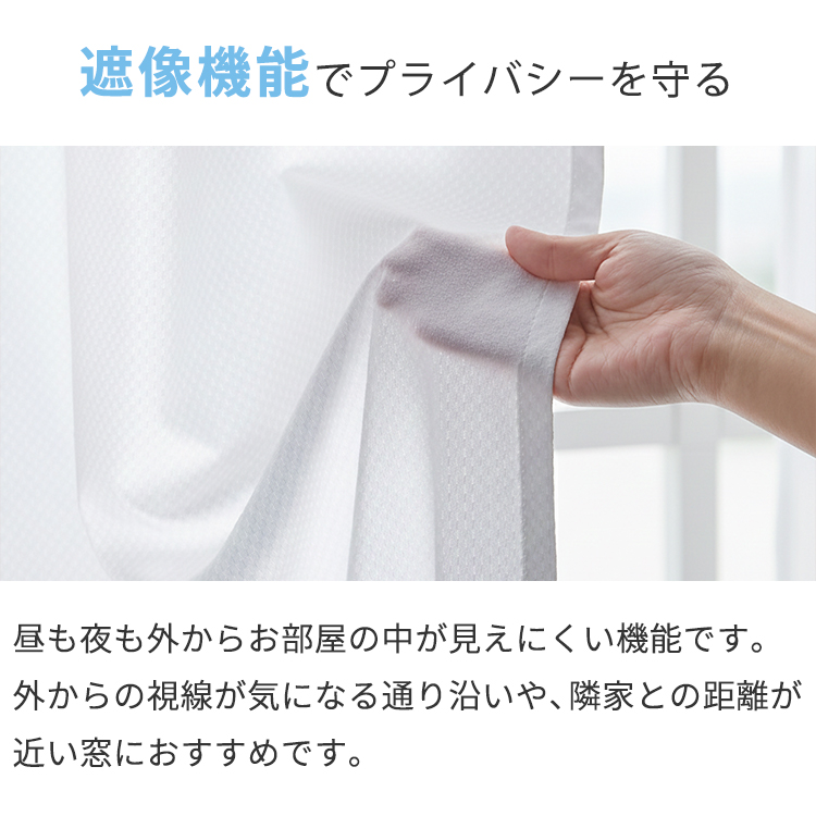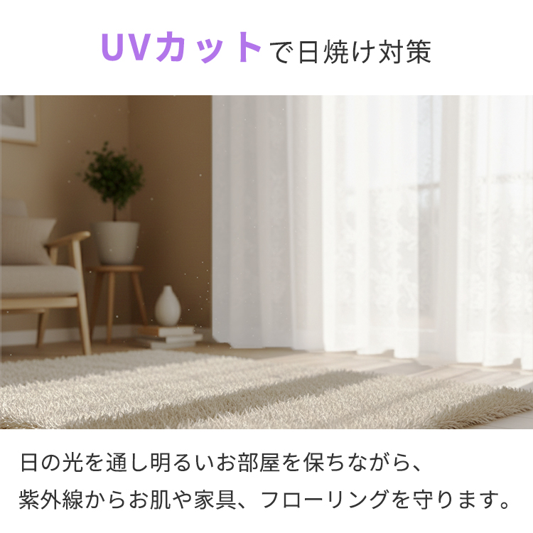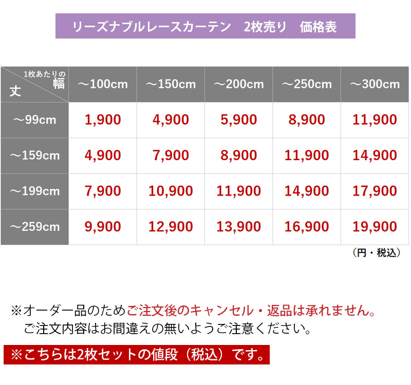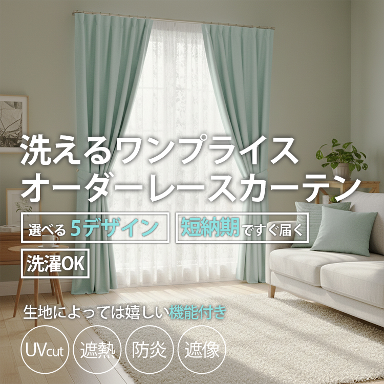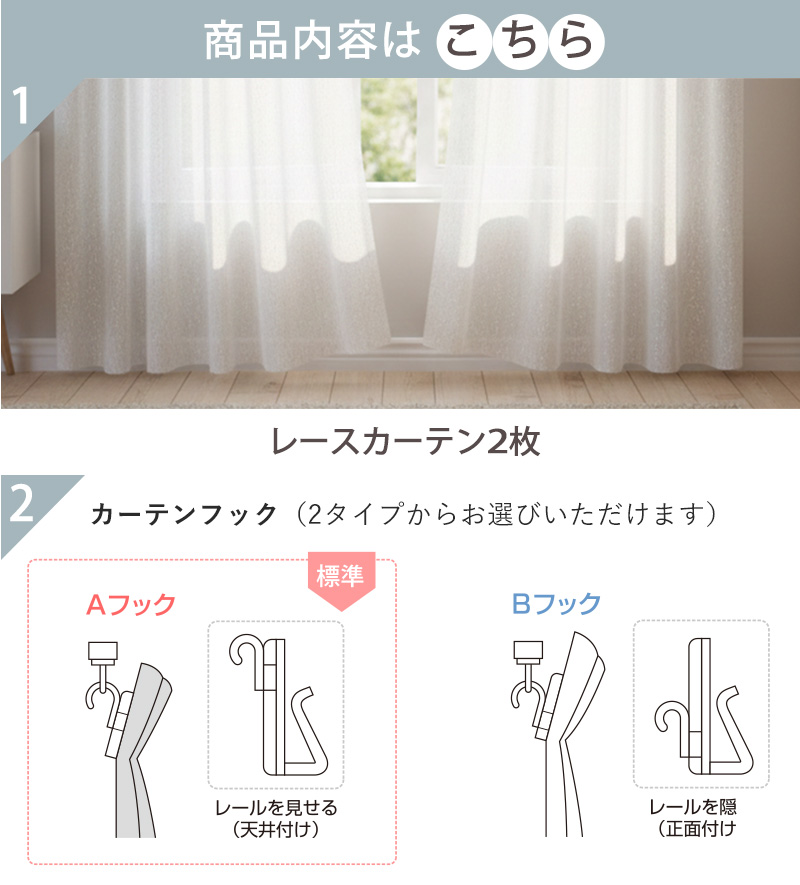 | 注意 | ※ご覧のモニターの環境、撮影環境により実物と色味が異なって見える場合が御座います。無料サンプルをご請求いただき実際のお色味を必ずご確認ください。 ※商品名に表記されているサイズ(丈)はカーテンフックのレール取付け部分から測った長さを表記しています。 ※仕上がりサイズは縫製工程上、1cm程度の誤差がある場合がございます。丈はフックのアジャスターでご調節ください。 ※厚地カーテンを一緒にご購入の場合、レースカーテンの丈は厚地カーテンより-1〜2cmになるようにサイズ指定してください。 ※上記に関しての返品交換はお受けできかねます。 |