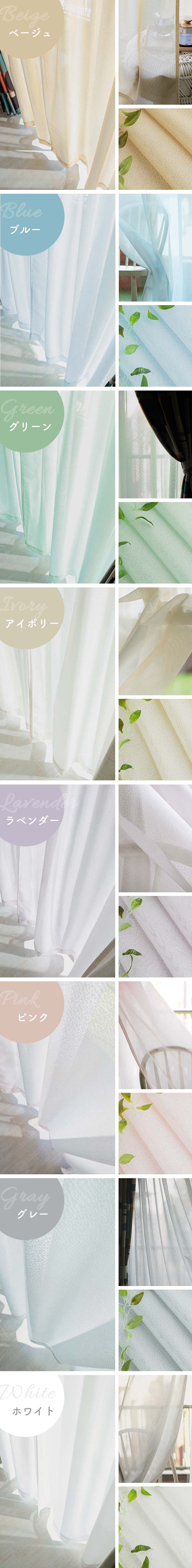 | 注意 | ※ご覧のモニターの環境、撮影環境により実物と色味が異なって見える場合が御座います。無料サンプルをご請求いただき実際のお色味を必ずご確認ください。 ※商品名に表記されているサイズ(丈)はカーテンフックのレール取付け部分から測った長さを表記しています。 ※仕上がりサイズは縫製工程上、1cm程度の誤差がある場合がございます。丈はフックのアジャスターでご調節ください。 ※幅101cm以上の商品は継ぎ部分があります。 ※厚地カーテンを一緒にご購入の場合、レースカーテンの丈は厚地カーテンより-1〜2cmになるようにサイズ指定してください。 ※上記に関しての返品交換はお受けできかねます。 |