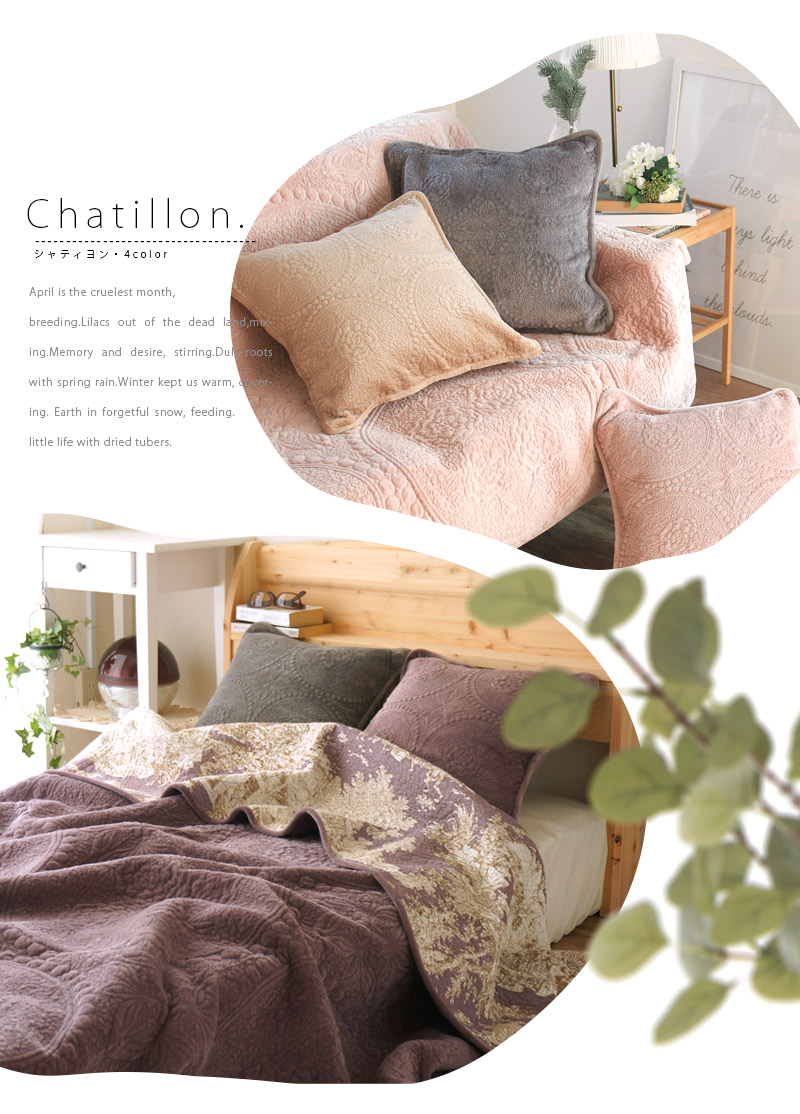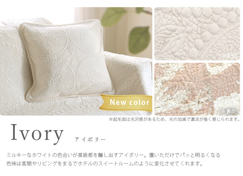 上品なパープルとグレー・アイボリーの色からお選びいただけるエレガントなクッションカバー。表面には細かいキルトの刺繍が施されお部屋に飾るだけで、一気にラグジュアリーな雰囲気をアップさせます。裏面は表面に合わせた色味をバックに人気のトワル・ド・ジュイの柄で仕上げ、気分に合わせて2タイプの雰囲気を味わえるラグジュアリーな一枚!いつものクッションも気軽にイメージチェンジが可能です。