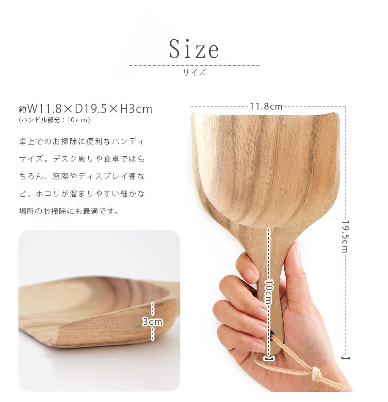 表情豊かなアカシアの木目に癒される、レトロで小さなちりとり。軽くて丈夫なことで知られるアカシア材を贅沢に使用し、継ぎ目のないなめらかな曲線に仕上げました。緩やかに広がっていくカーブが手にぴったりフィットして、どんな持ち方をしても握りやすく、気になるところをササっと手軽にお掃除できます。持ち手の先には本革のひもが付いていて、フックなどに掛けてオシャレに収納できるのも嬉しい♪素朴な雰囲気とシンプルな装いはどんなお部屋にもよく合い、別売りのミニほうきと合わせて使えば、よりオシャレに、便利に使えます。