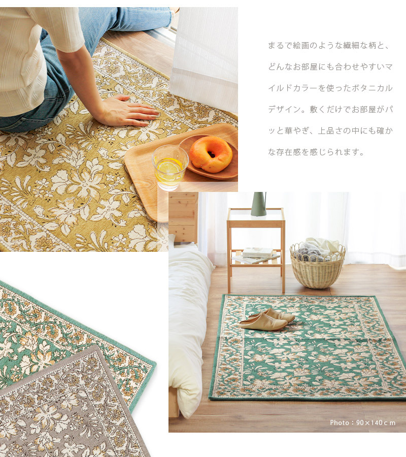 芸術性の高いクラシカルな風合いに、目の詰まった重厚感ある質感が魅力のゴブランシェニールラグ。まるで絵画のような繊細かつ大胆な植物柄は、敷くだけでお部屋がパッと華やぎ、上品さの中にも確かな存在感を感じられます。生地にはしなやかでサラッとした触り心地のシェニール糸を使用し、遊び毛が出にくくお手入れやお掃除も簡単♪季節を問わず快適に使えて、耐久性にも優れた逸品です。