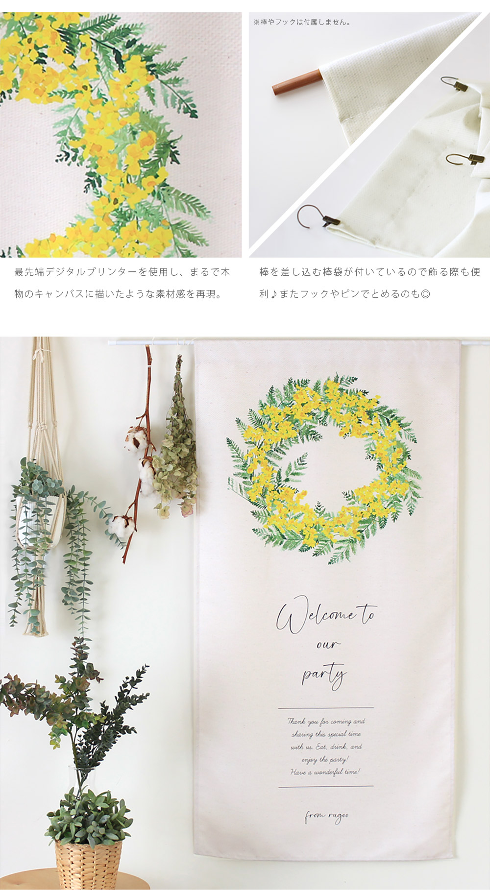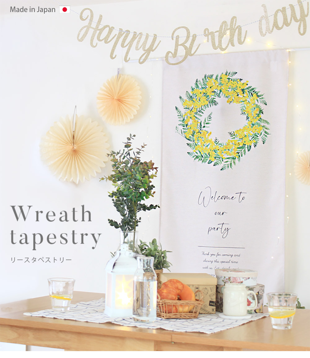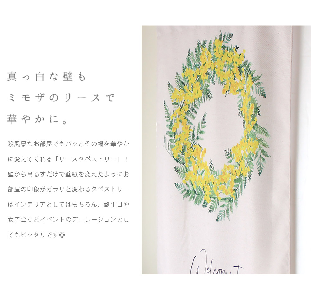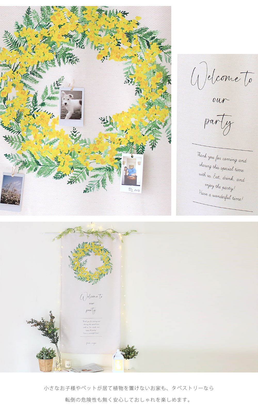 殺風景なお部屋の壁をパッと華やかにしてくれるミモザのとケーキのタペストリー♪ 壁に掛けるだけで壁紙を変えたようにお部屋の印象がガラリと変わるタペストリーはインテリアとしてはもちろん、パーティーや女子会などイベントのデコレーションとしてもピッタリ◎またピンを使えば思い出の写真や飾りを自由に付けられるので、海外のようなホームウエディングやお子様の誕生日会の飾りつけにおススメの商品です。
