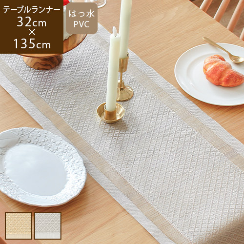 ■汚れにくいPVCコーティング 飲みこぼしなどの水分が繊維に染み込まない撥水素材のPVC。汚れが付着しにくく、日々の食事に利用しやすいテーブルランナーに仕上げました。