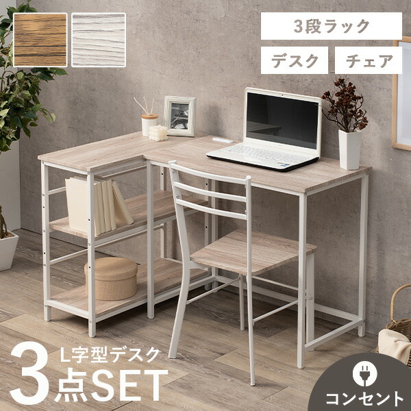 デスク チェア セット 3点セット 3段ラック 2口コンセント付き 机 椅子 デスクワーク 作業台 在宅ワーク リモート シンプル おしゃれ ナノ