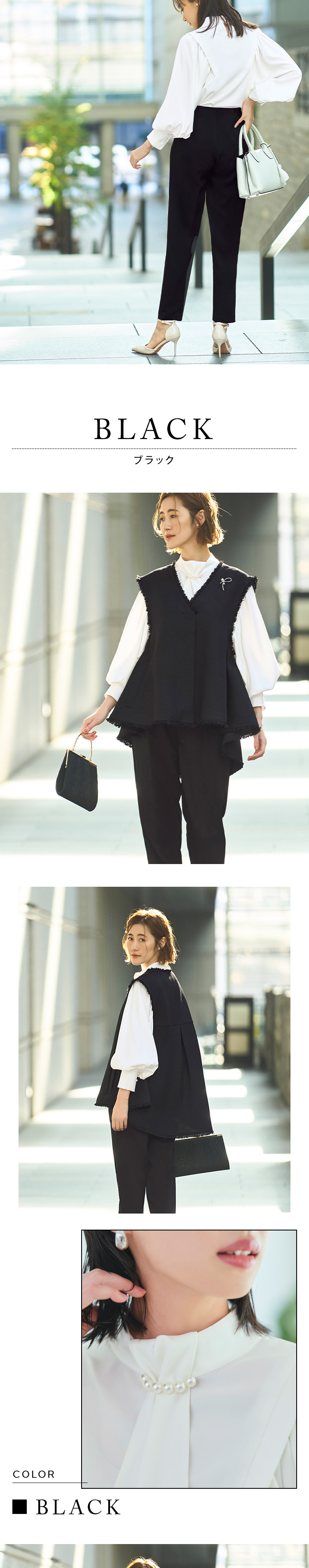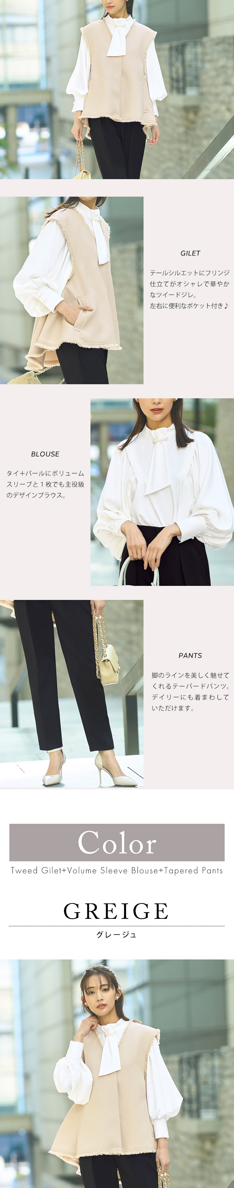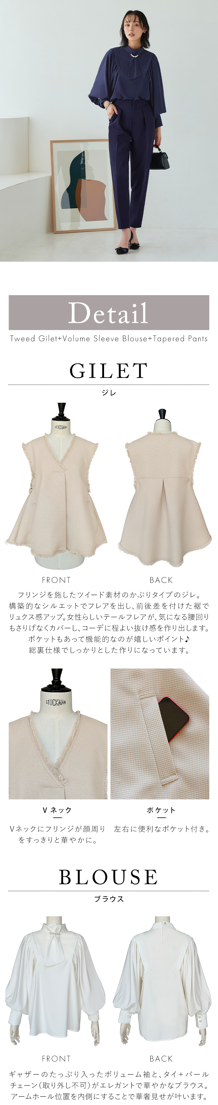 | 【3点セット】バスケットツイードジレ&タイパールチェーンボリューム袖ブラウス&テーパードパンツ(SU1340) |