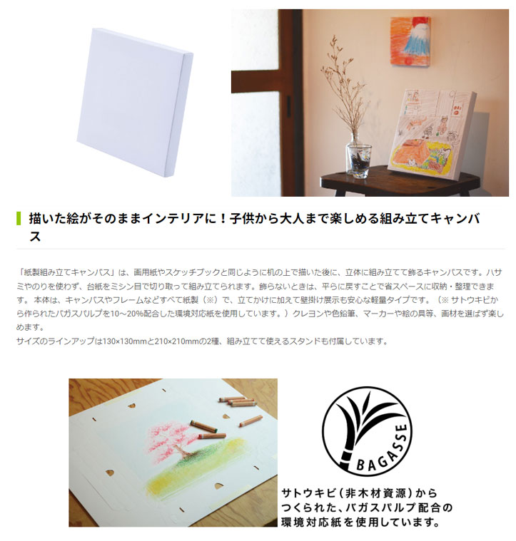 ・描いた絵をそのまま飾れる、環境対応紙を使用した組み立て式のキャンバス ・組み立て前は、画用紙やスケッチブックに描く時と同じような感覚で絵を描ける ・ハサミやのりを使わす、台紙をミシン目で切り取って組み立て完了 ・組み立てて使えるスタンドが付属、壁掛け展示に対応するフック穴付き仕様 ・サトウキビから作られたばバガスパルプを10〜20%配合した環境対応紙を使用 |