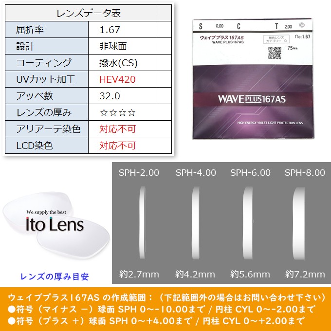 メガネセット用 レンズオプション 送料無料 カラー染色不可 ITOLENS ウェイブプラス HEV420 屈折1.67 非球面 オプションレンズ